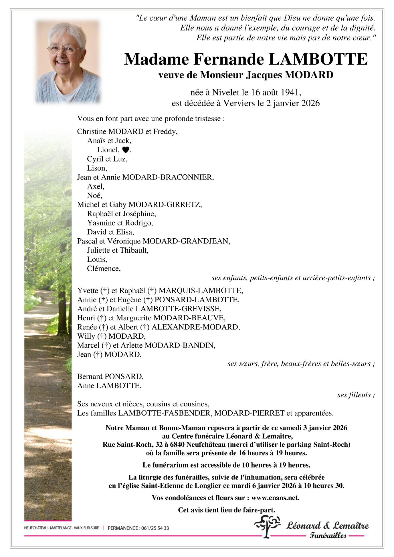 Décédée à Verviers (4800) le vendredi 2 janvier 2026 à l'âge de 84 ans