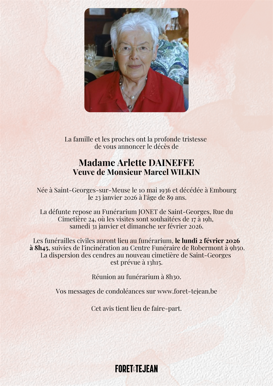 Décédée à Embourg (4053) le vendredi 23 janvier 2026 à l'âge de 89 ans