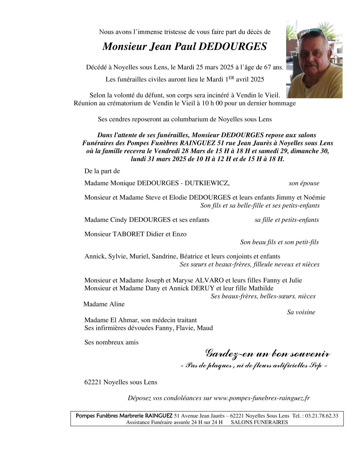 Décédé à Noyelles-sous-Lens (62221, France) le mardi 25 mars 2025 à l'âge de 67 ans