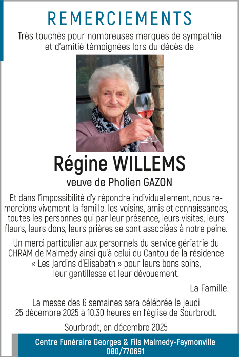 Madame Régine WILLEMS veuve de Pholien GAZON