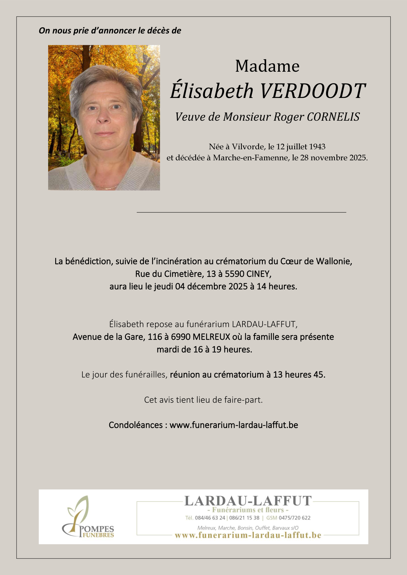 Décédée à Marche-en-Famenne (6900) le vendredi 28 novembre 2025 à l'âge de 82 ans