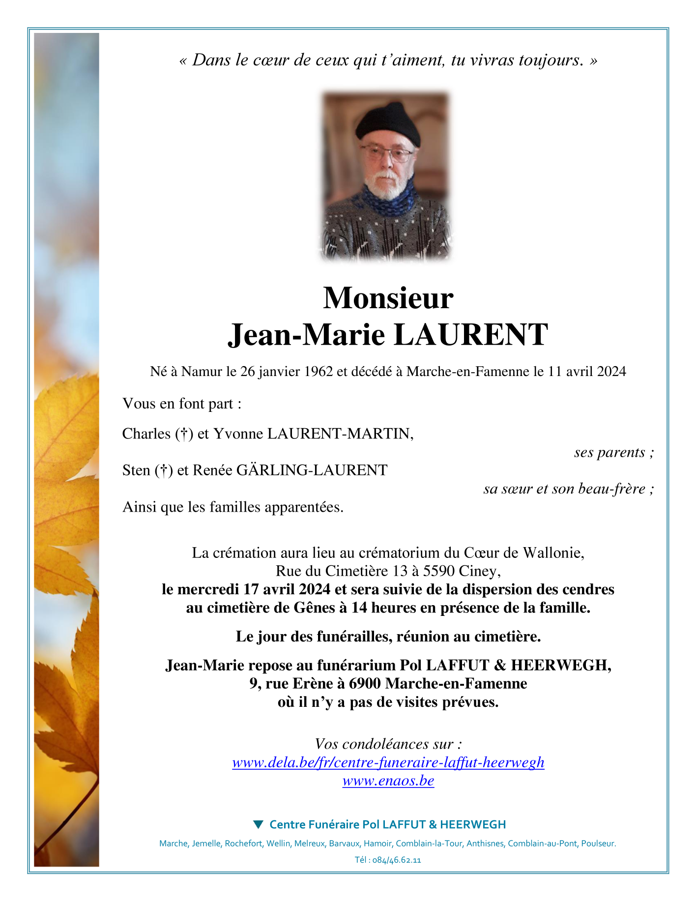 Fallecido en Marche-en-Famenne (6900) el jueves, 11 de abril de 2024 a la edad de 62 años
