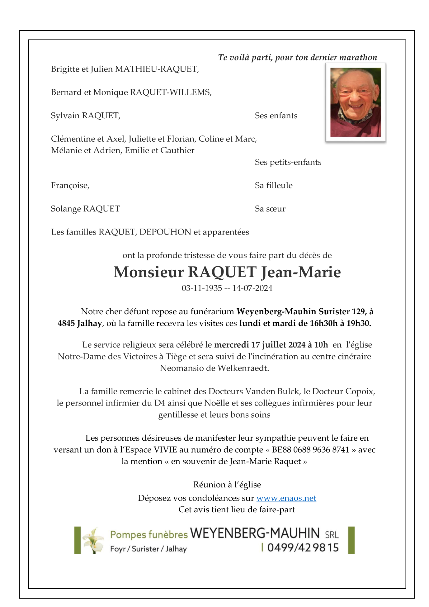Décédé à Tiège (4845) le dimanche 14 juillet 2024 à l'âge de 88 ans