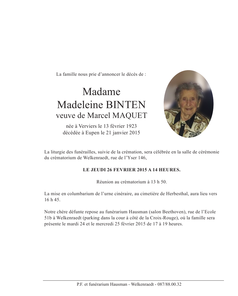Décédée à Eupen (4700) le samedi 21 février 2015 à l'âge de 92 ans