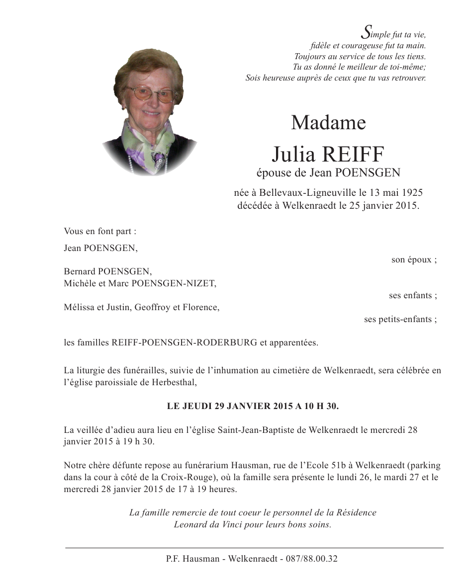 Died in Welkenraedt (4840) on 25 January 2015 at the age of 89 years