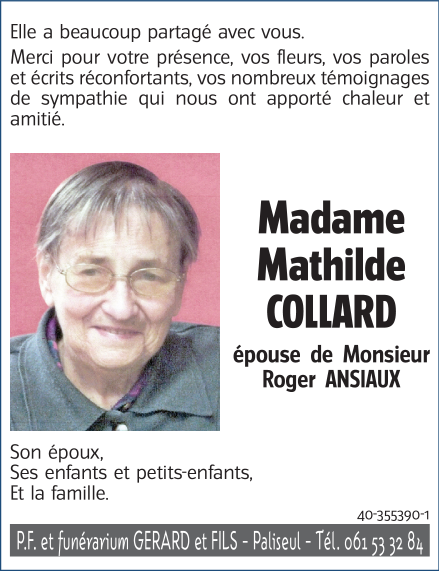 Fallecida en Carlsbourg (6850) el viernes, 19 de febrero de 2021 a la edad de 87 años