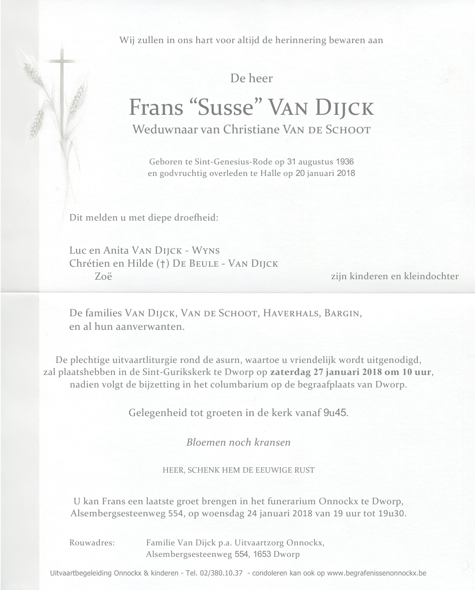 Overleden te Halle (1500) op zaterdag 20 januari 2018 op 81-jarige leeftijd