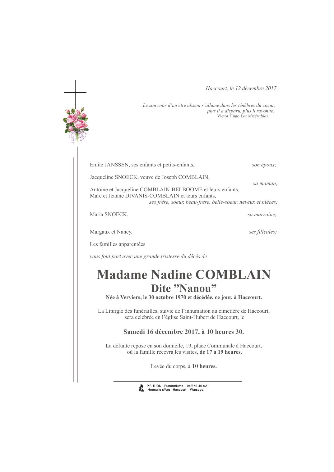Décédée à Haccourt (4684) le mardi 12 décembre 2017 à l'âge de 47 ans
