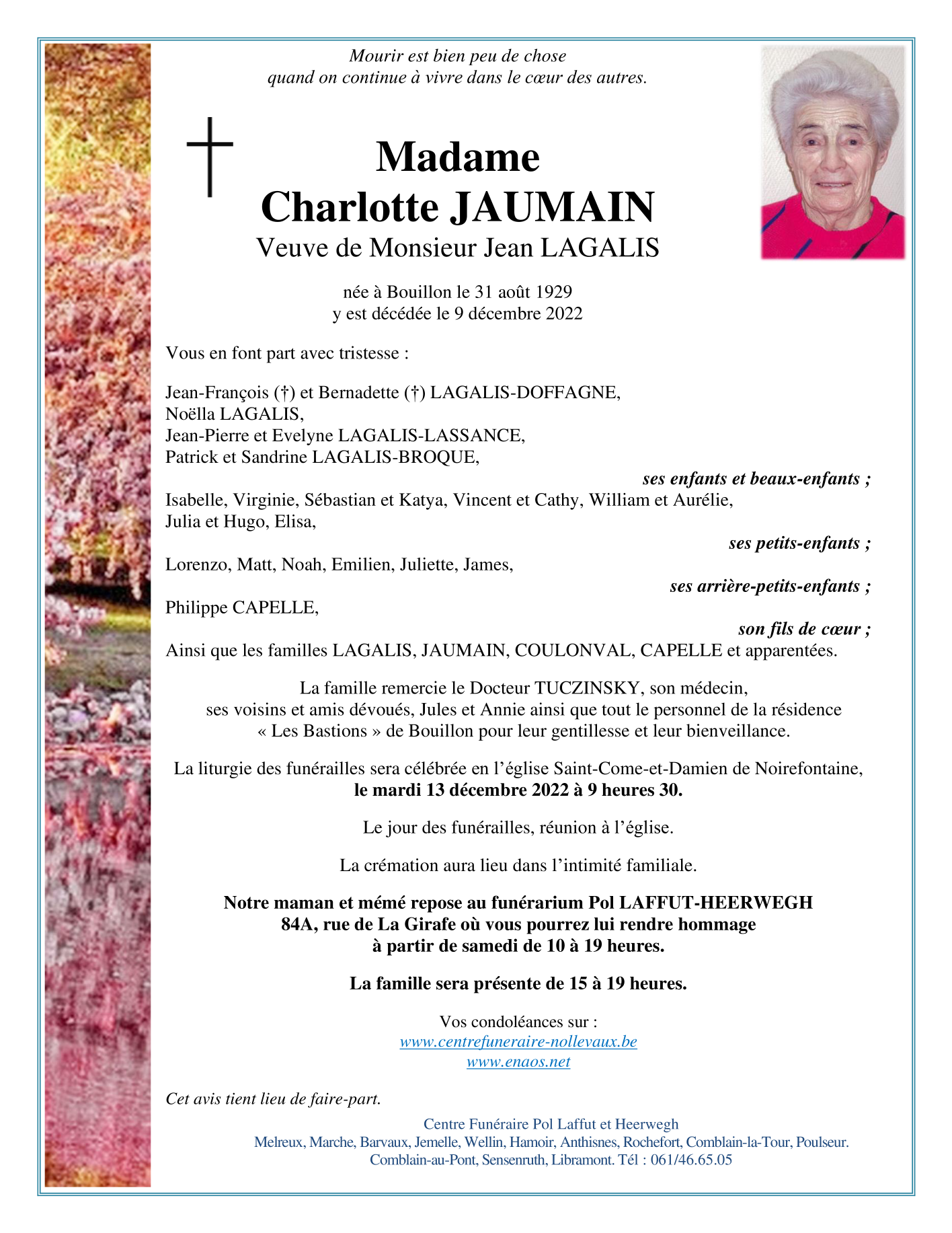 Fallecida en Bouillon (6830) el viernes, 9 de diciembre de 2022 a la edad de 93 años