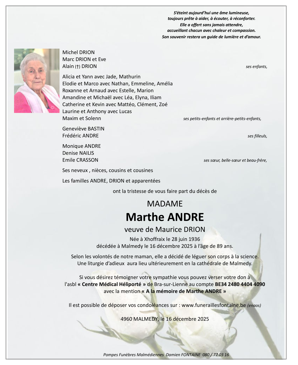 Décédée à Malmedy (4960) le mardi 16 décembre 2025 à l'âge de 89 ans