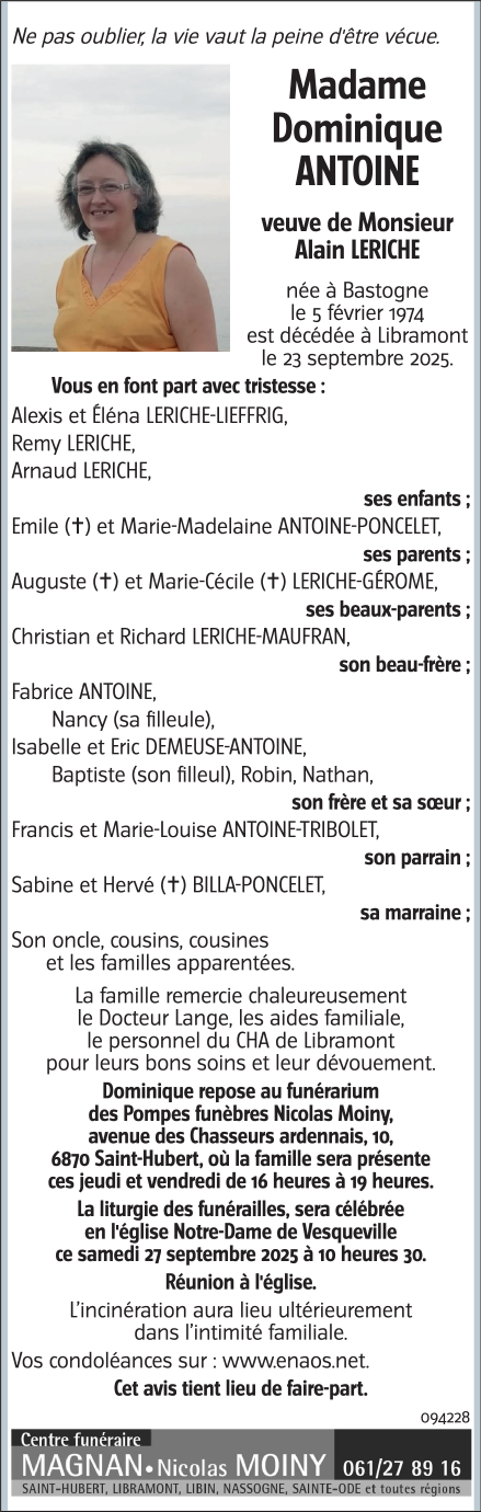 Décédée à Libramont (6800) le mardi 23 septembre 2025 à l'âge de 51 ans