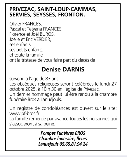 Décédée à Privezac (12350, France) le mercredi 22 octobre 2025 à l'âge de 83 ans