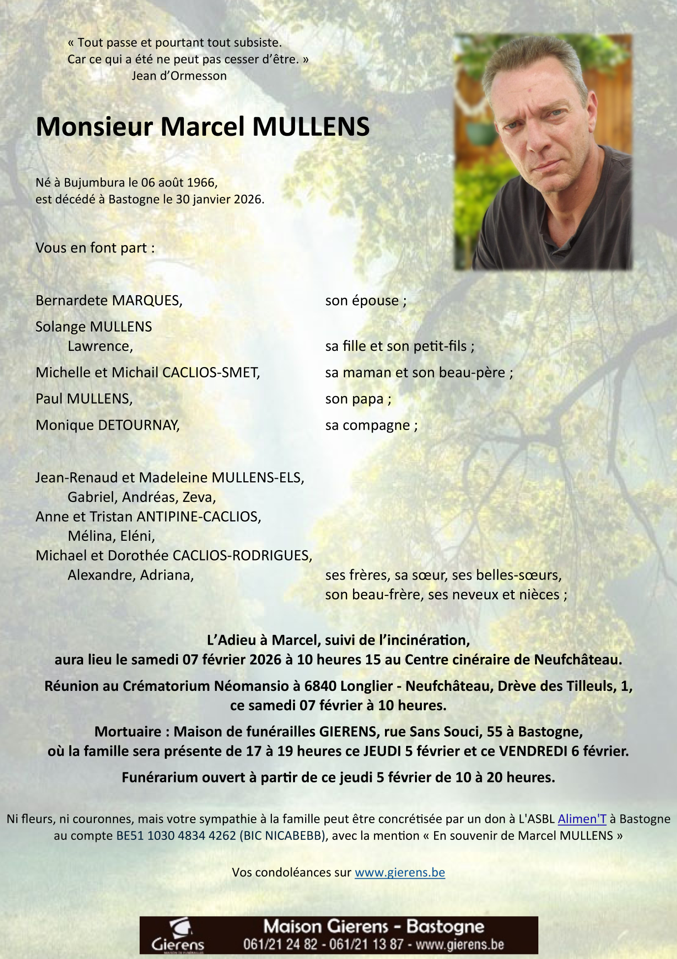 Décédé à Bastogne (6600) le vendredi 30 janvier 2026 à l'âge de 59 ans