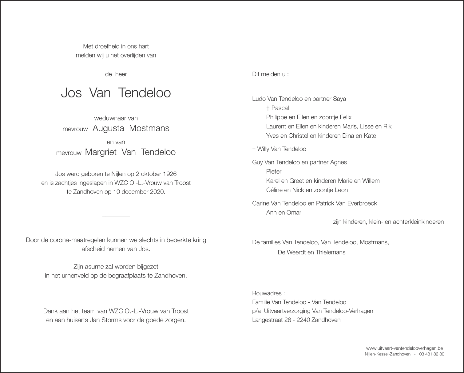 Décédé à Zandhoven (2240) le jeudi 10 décembre 2020 à l'âge de 94 ans