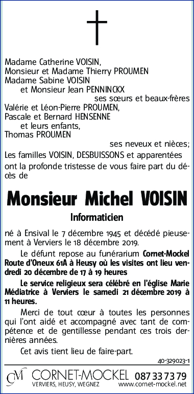 Décédé à Verviers (4800) le mercredi 18 décembre 2019 à l'âge de 74 ans