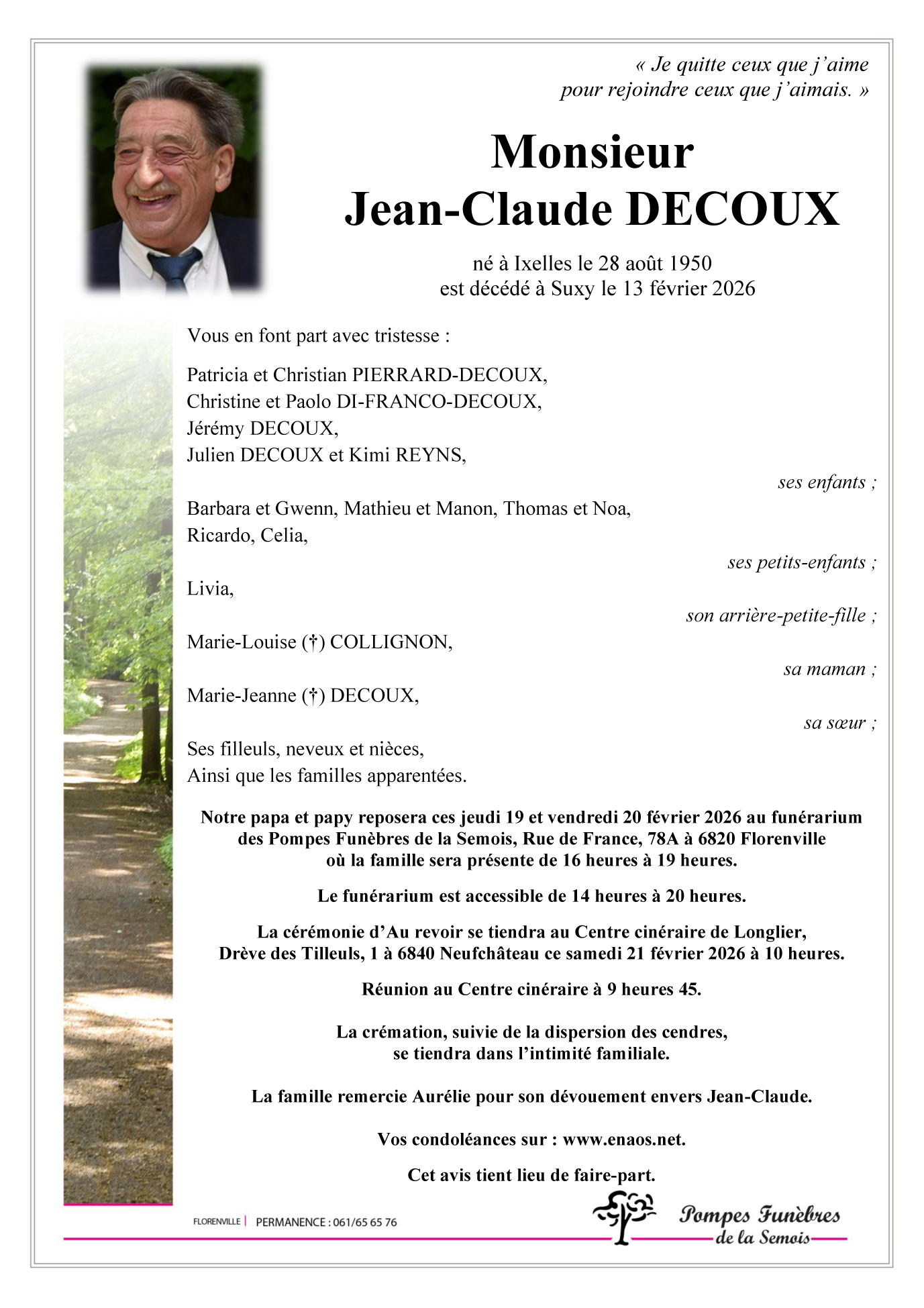 Décédé à Suxy (6812) le vendredi 13 février 2026 à l'âge de 75 ans