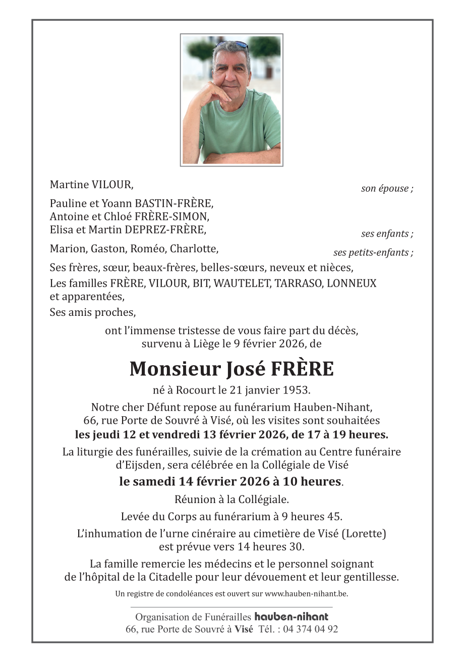 Décédé à Liège (4000) le lundi 9 février 2026 à l'âge de 73 ans
