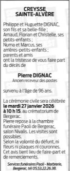 Décédé à Bergerac (24100, France) le lundi 19 janvier 2026 à l'âge de 96 ans