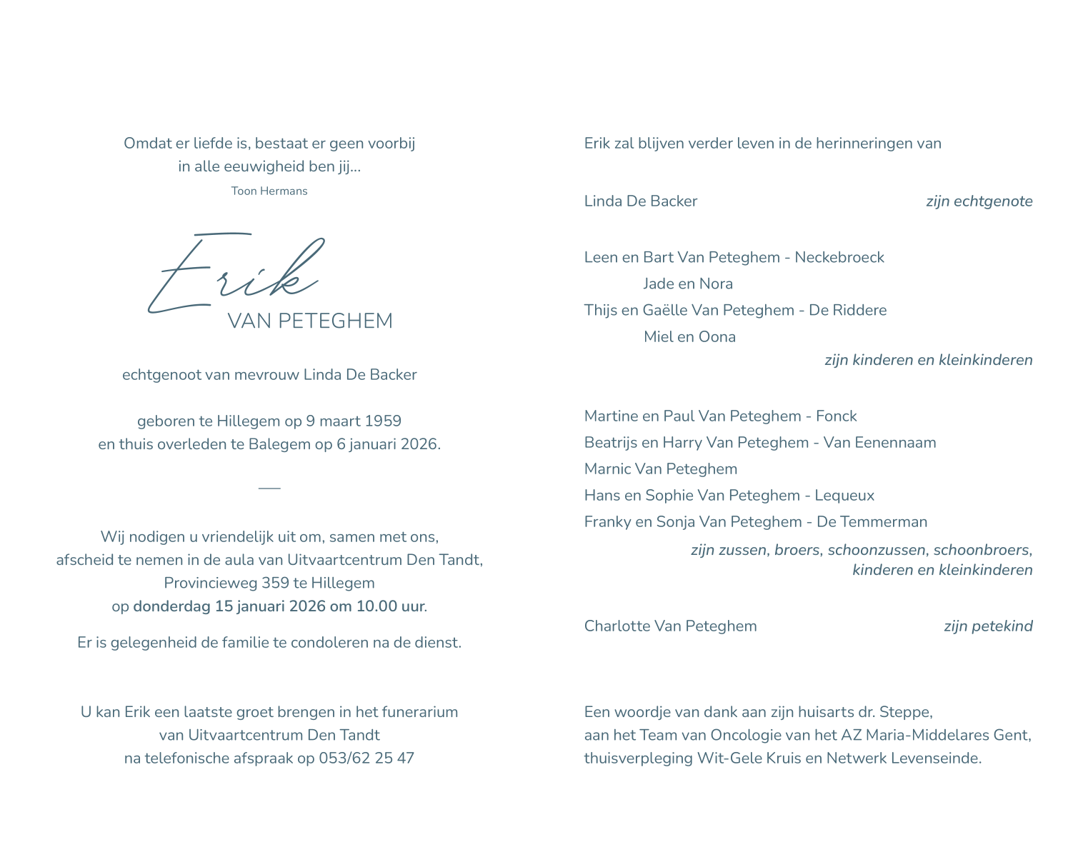 Décédé à Balegem (9860) le mardi 6 janvier 2026 à l'âge de 66 ans