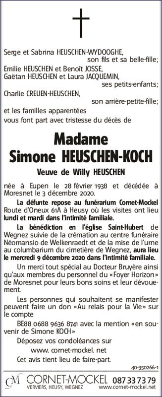 Décédée à Plombières (4850) le jeudi 3 décembre 2020 à l'âge de 82 ans