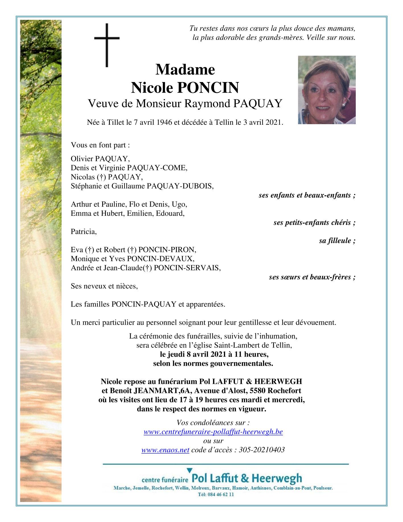 Décédée à Tellin (6927) le samedi 3 avril 2021 à l'âge de 74 ans