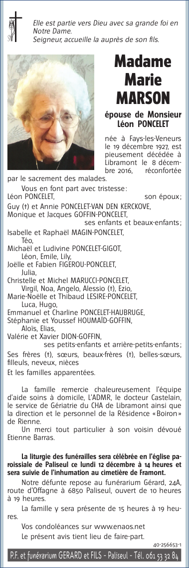 Fallecida en Libramont (6800) el jueves, 8 de diciembre de 2016 a la edad de 88 años