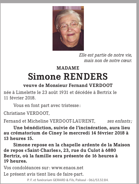 Died in Bertrix (6880) on 11 February 2018 at the age of 86 years