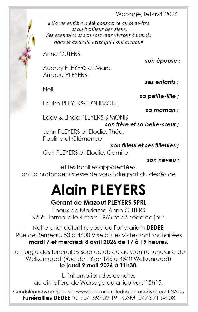 Décédé à Hermalle-sous-Argenteau (4681) le mercredi 1 avril 2026 à l'âge de 63 ans
