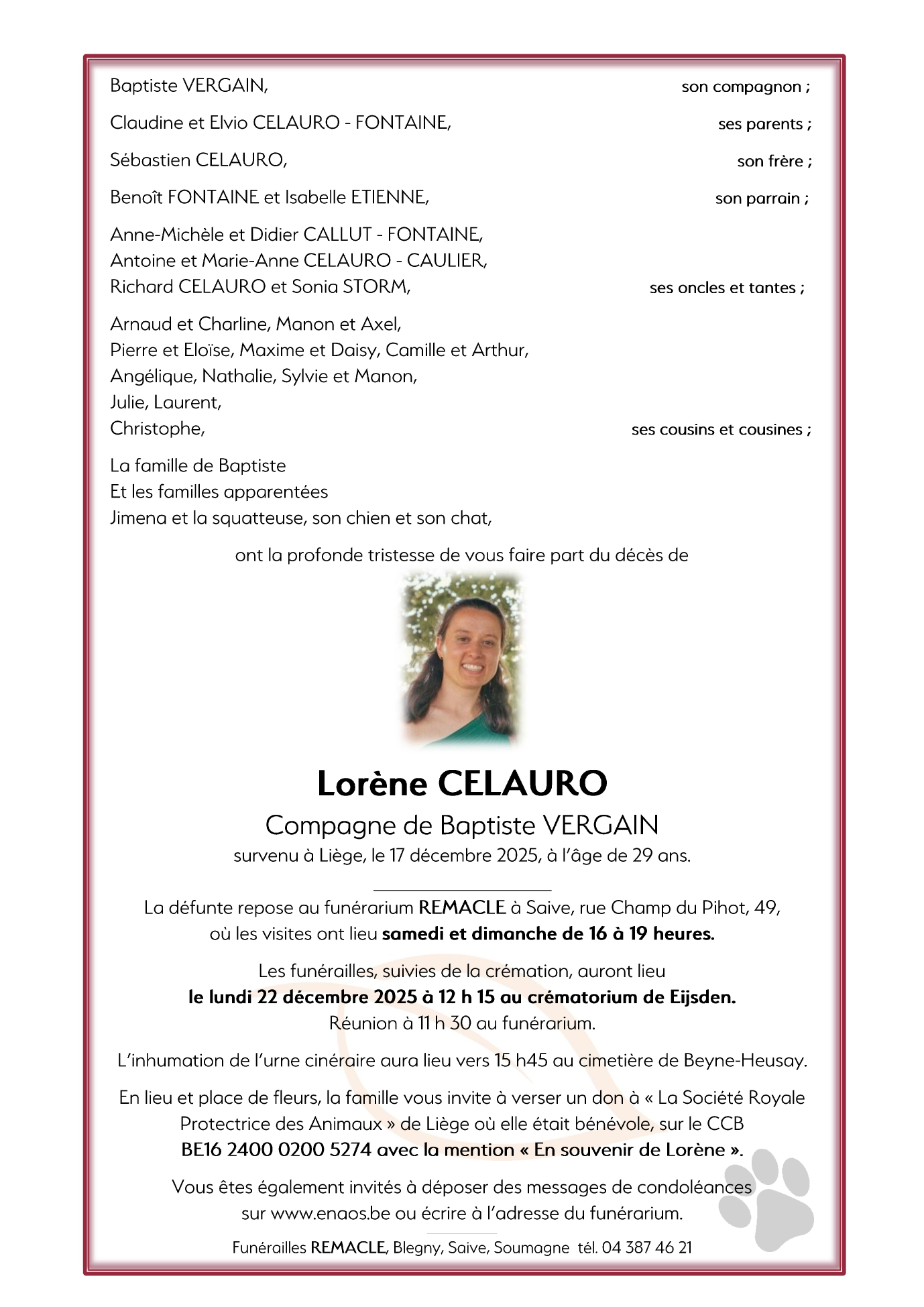 Décédée à Liège (4000) le mercredi 17 décembre 2025 à l'âge de 29 ans