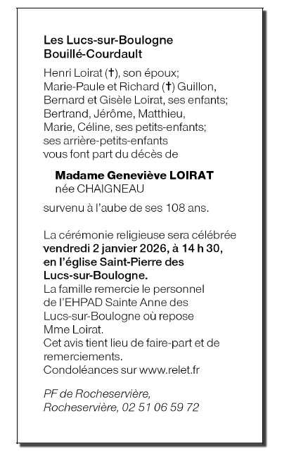 Died in Les Lucs-sur-Boulogne (85170, France) on 29 December 2025 at the age of 107 years