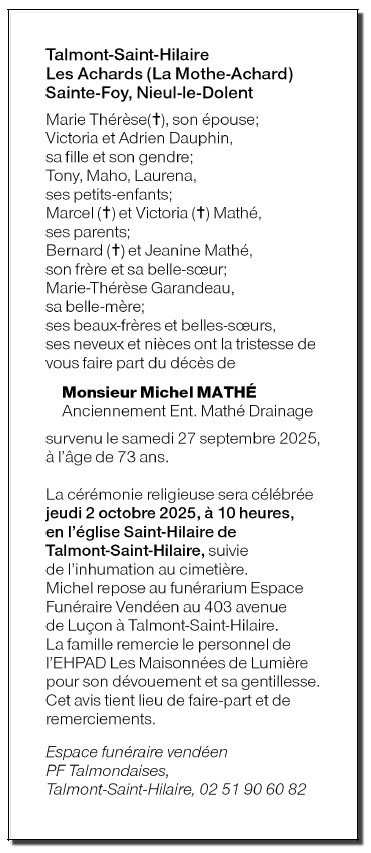 Décédé à Les Sables d'Olonne (85100, France) le samedi 27 septembre 2025 à l'âge de 73 ans