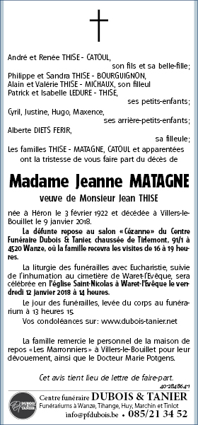 Died in Villers-le-Bouillet (4530) on 09 January 2018 at the age of 95 years