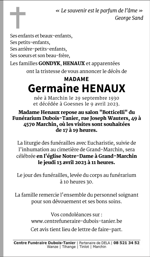 Décédée à Goesnes (5353) le dimanche 9 avril 2023 à l'âge de 92 ans