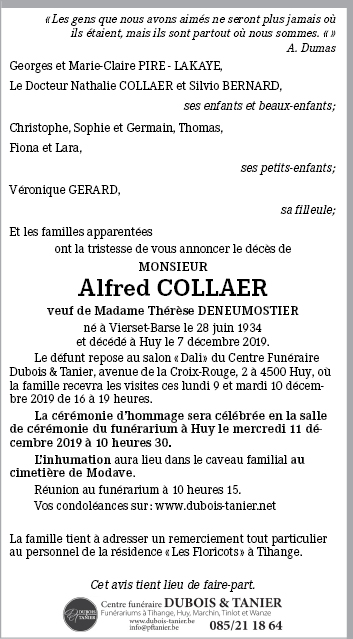 Overleden te Huy (4500) op zaterdag 7 december 2019 op 85-jarige leeftijd