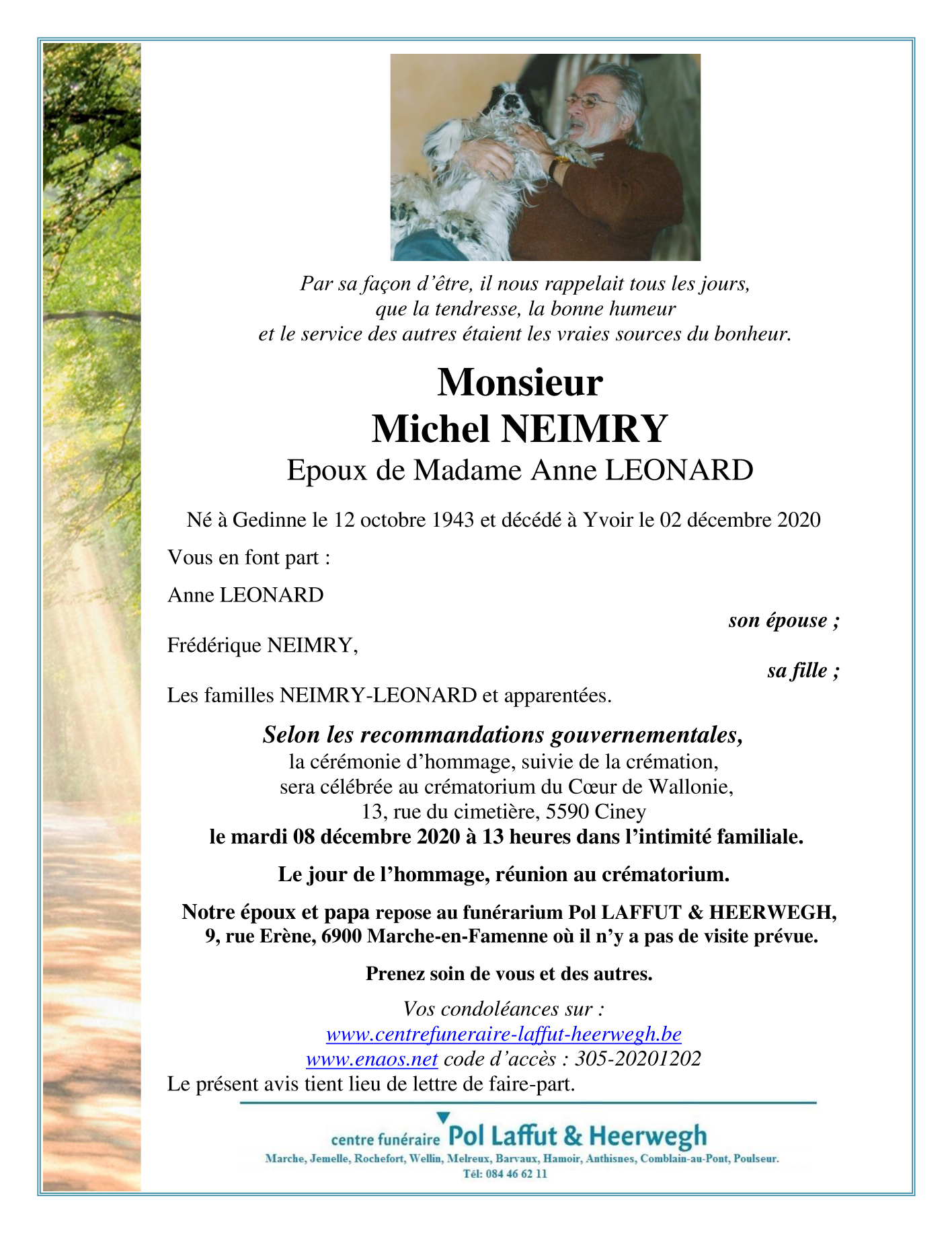 Décédé à Yvoir (5530) le mercredi 2 décembre 2020 à l'âge de 77 ans