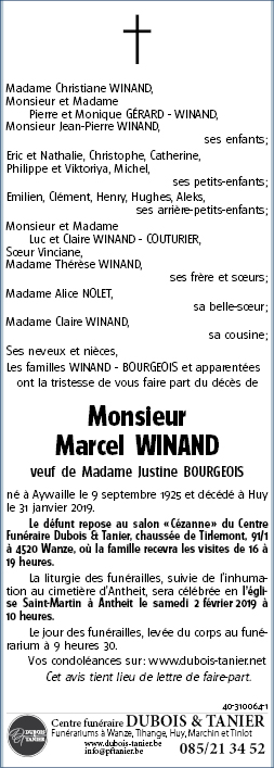 Décédé à Huy (4500) le jeudi 31 janvier 2019 à l'âge de 93 ans
