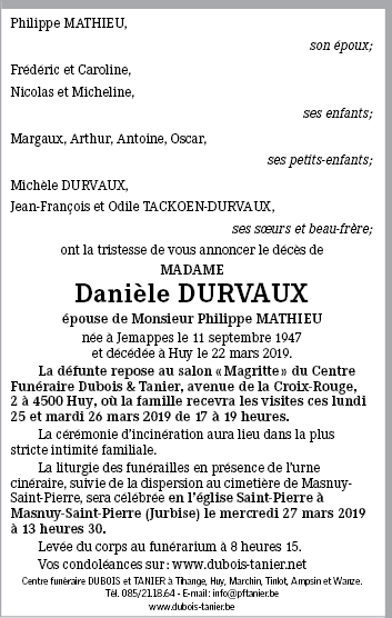 Décédée à Huy (4500) le vendredi 22 mars 2019 à l'âge de 71 ans