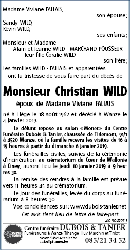 Décédé à Wanze (4520) le vendredi 4 janvier 2019 à l'âge de 56 ans