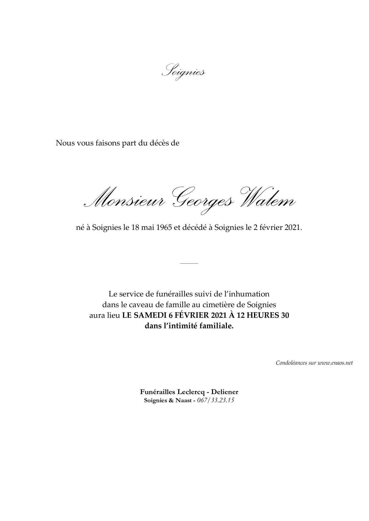 Died in Soignies (7060) on 02 February 2021 at the age of 55 years