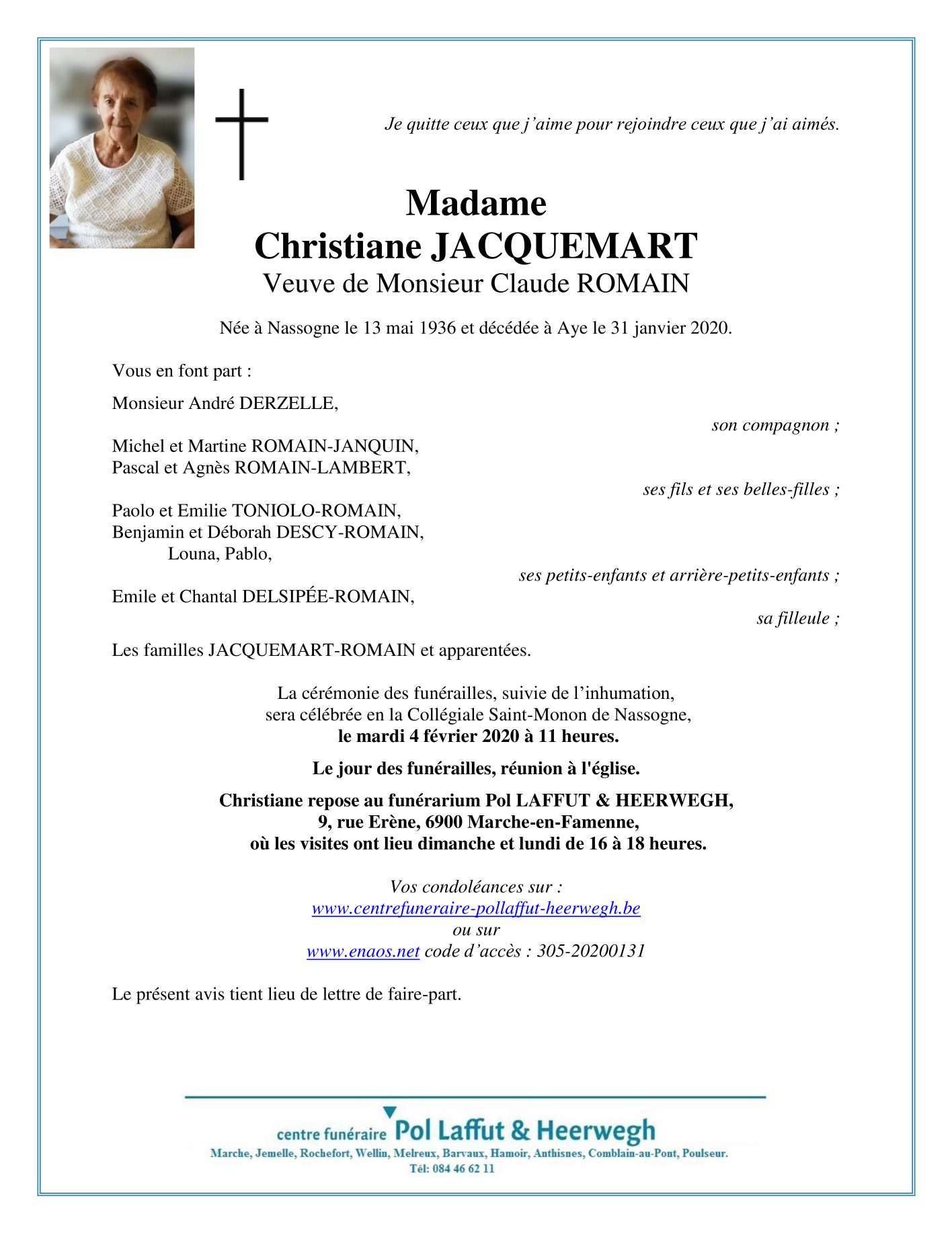 Overleden te Aye (6900) op vrijdag 31 januari 2020 op 83-jarige leeftijd