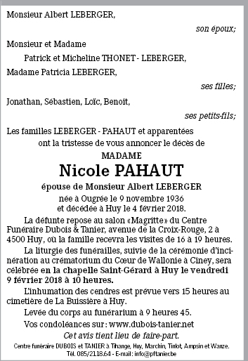 Fallecida en Huy (4500) el domingo, 4 de febrero de 2018 a la edad de 81 años