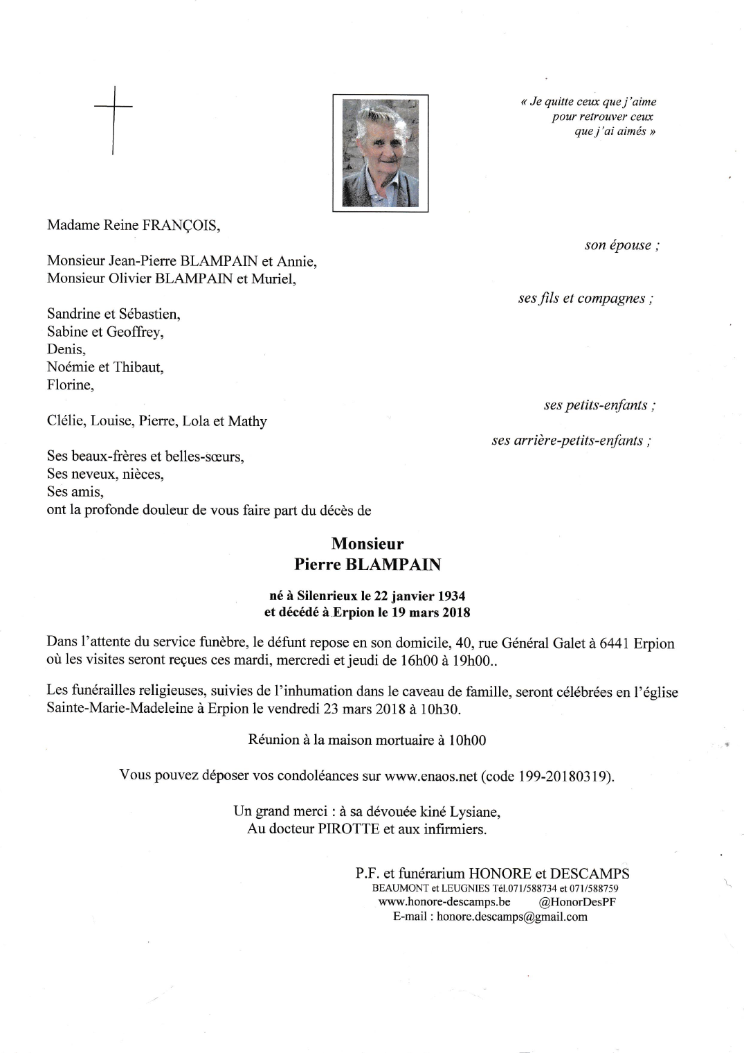 Décédé à Erpion (6441) le lundi 19 mars 2018 à l'âge de 84 ans