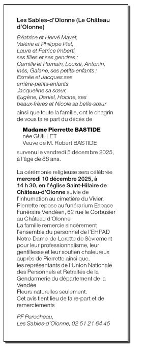 Décédée à Sèvremont (85700, France) le vendredi 5 décembre 2025 à l'âge de 88 ans