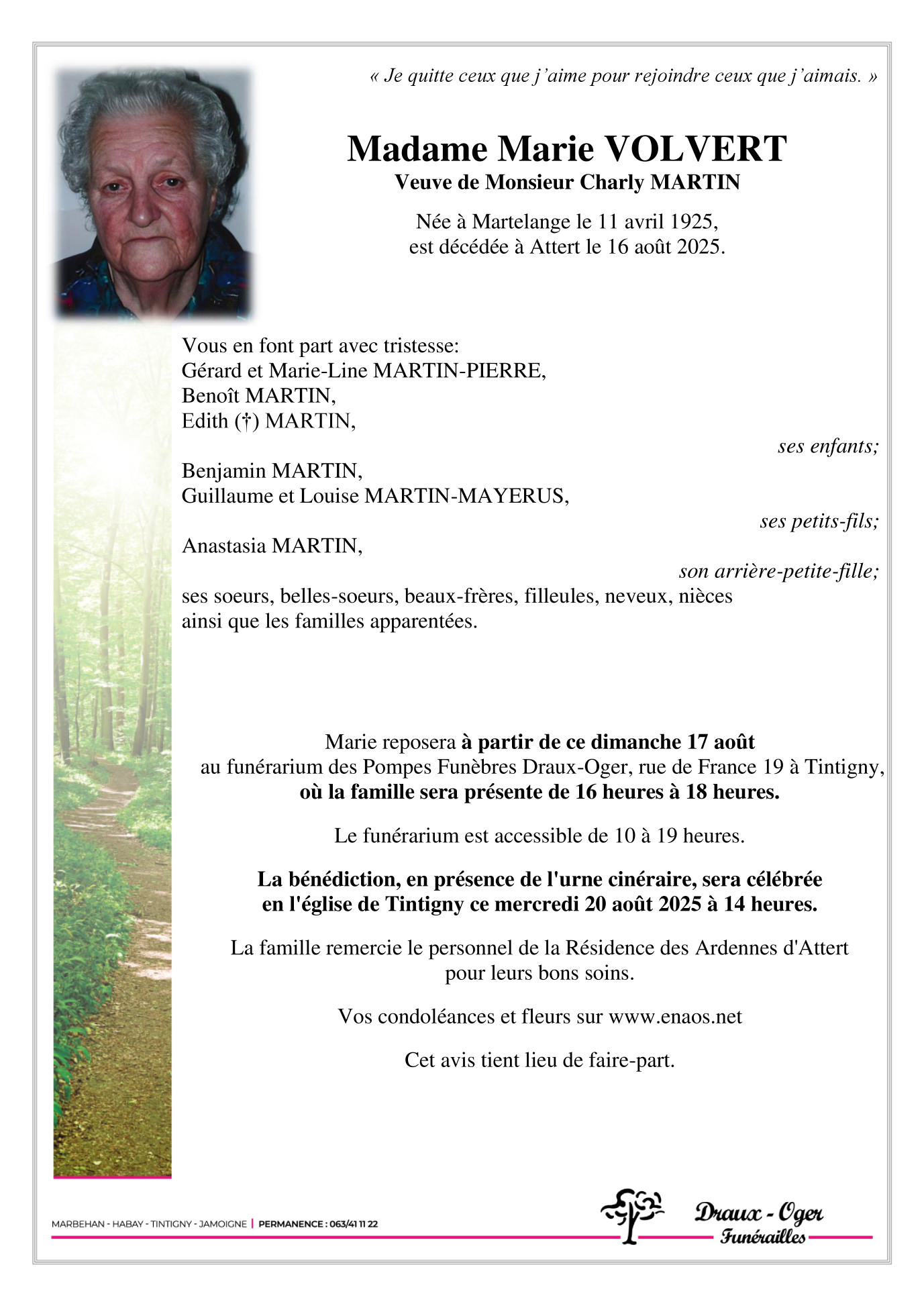 Décédée à Attert (6717) le samedi 16 août 2025 à l'âge de 100 ans