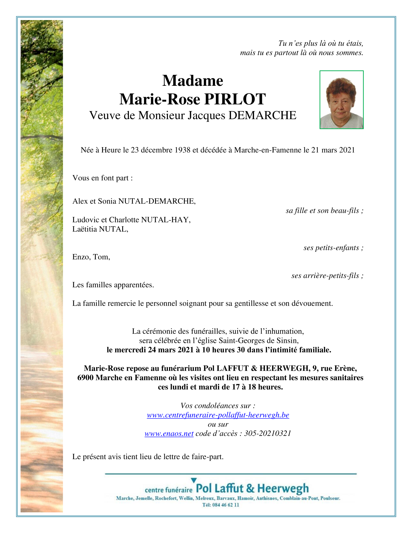 Décédée à Marche-en-Famenne (6900) le dimanche 21 mars 2021 à l'âge de 82 ans