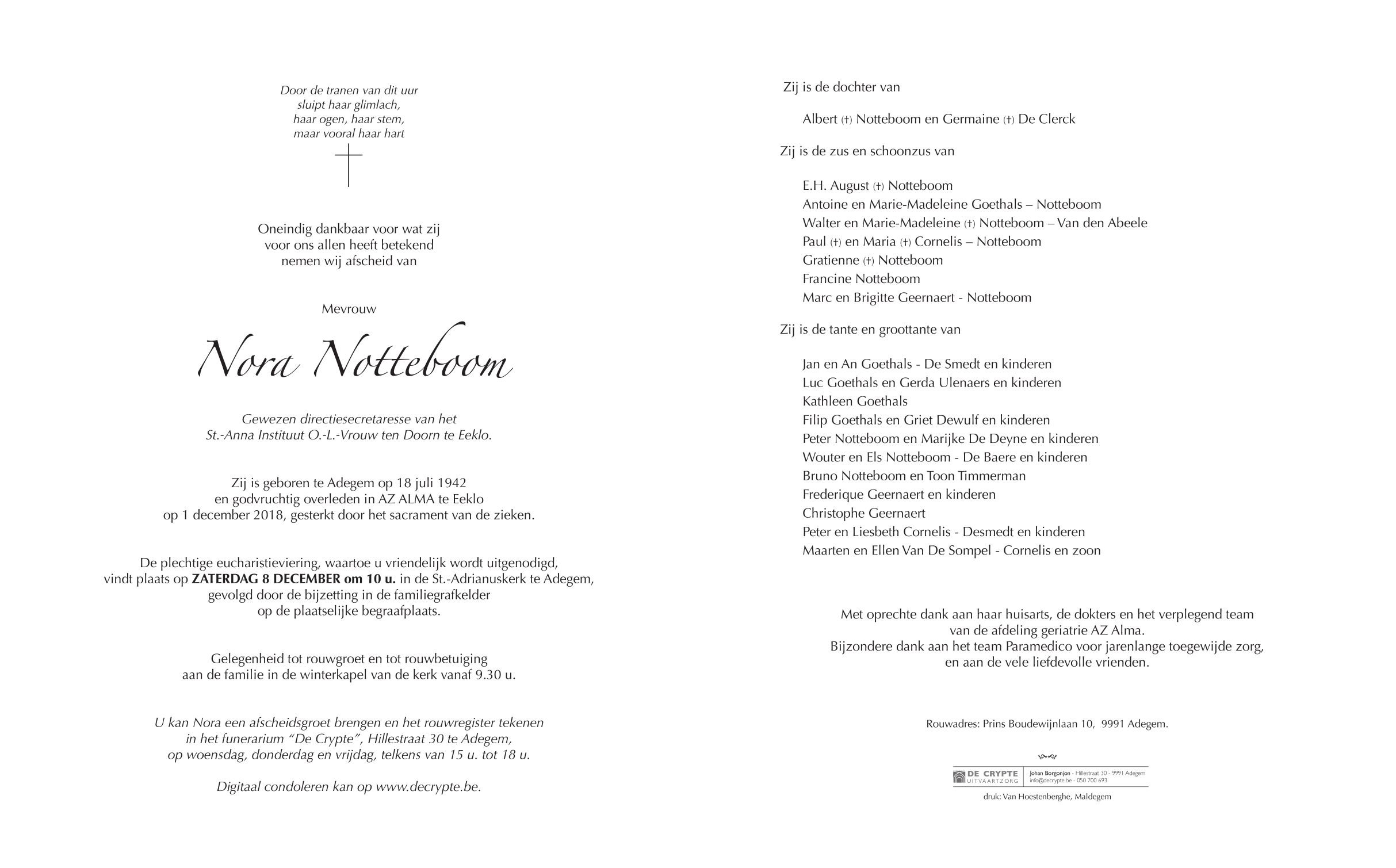 Née à Adegem (9991) le samedi 18 juillet 1942