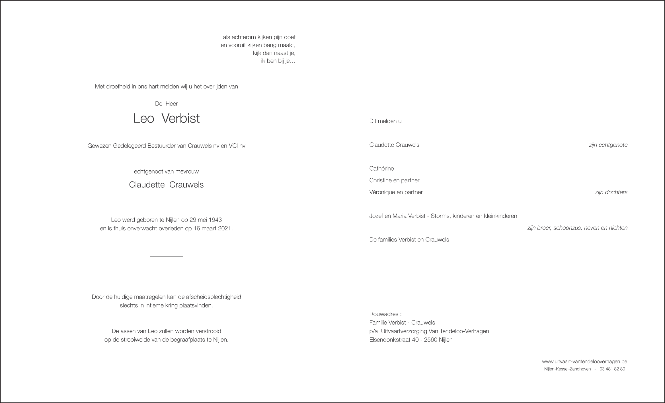 Décédé à Nijlen (2560) le mardi 16 mars 2021 à l'âge de 77 ans