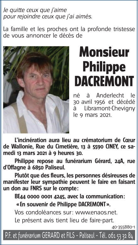 Décédé à Libramont (6800) le mardi 9 mars 2021 à l'âge de 64 ans