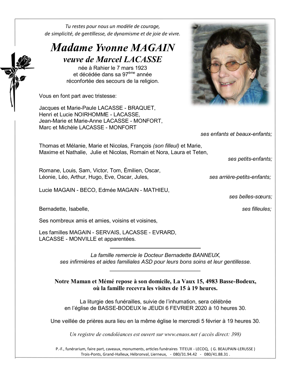 Décédée à Malmedy (4960) le dimanche 2 février 2020 à l'âge de 96 ans