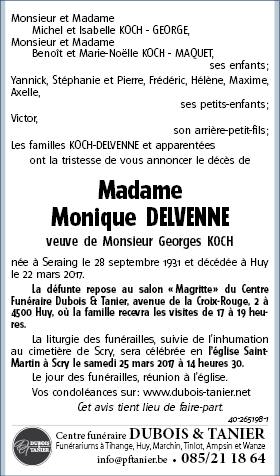 Décédée à Huy (4500) le mercredi 22 mars 2017 à l'âge de 85 ans